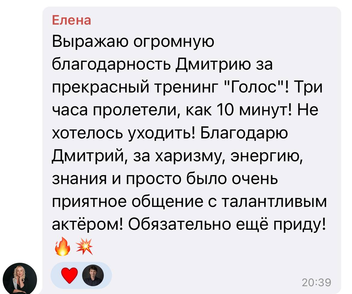 В процессе встречи Дмитрий откроет для Вас возможности Вашего природного голоса. Вы начнёте получать удовольствие от того, как звучите и от того, как Ваш голос начнёт по-особенному влиять на людей.