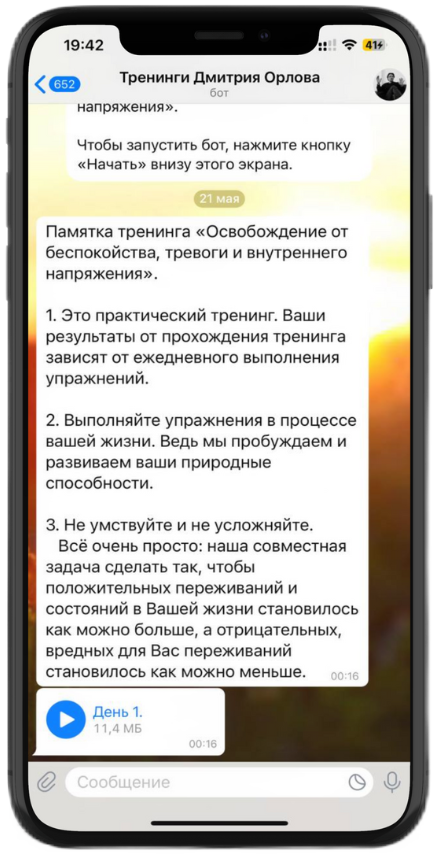 Тренинг Дмитрия - 7 голосовых сообщений, которые мы будем присылать Вам в телеграмм боте ежедневно на протяжении 7 дней в удобное для Вас время. Длительность одного сообщения от 3-6 минут.